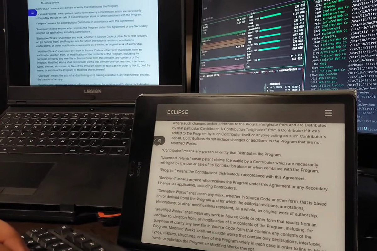 Інженер-програміст Алірези Алаві пропонує користувачам Linux скористатися дисплеєм E-ink як монітором комп’ютера. У відео він використав електронну книгу Boox для демонстрації цієї можливості. У ній читалка працює як дзеркальний дисплей його монітора, котра може стати пристроєм введення за наявності сенсорного екрана, що відкриває, наприклад, функцію малювання. Алаві наголошує на користі такого екрана для комфорту очей.