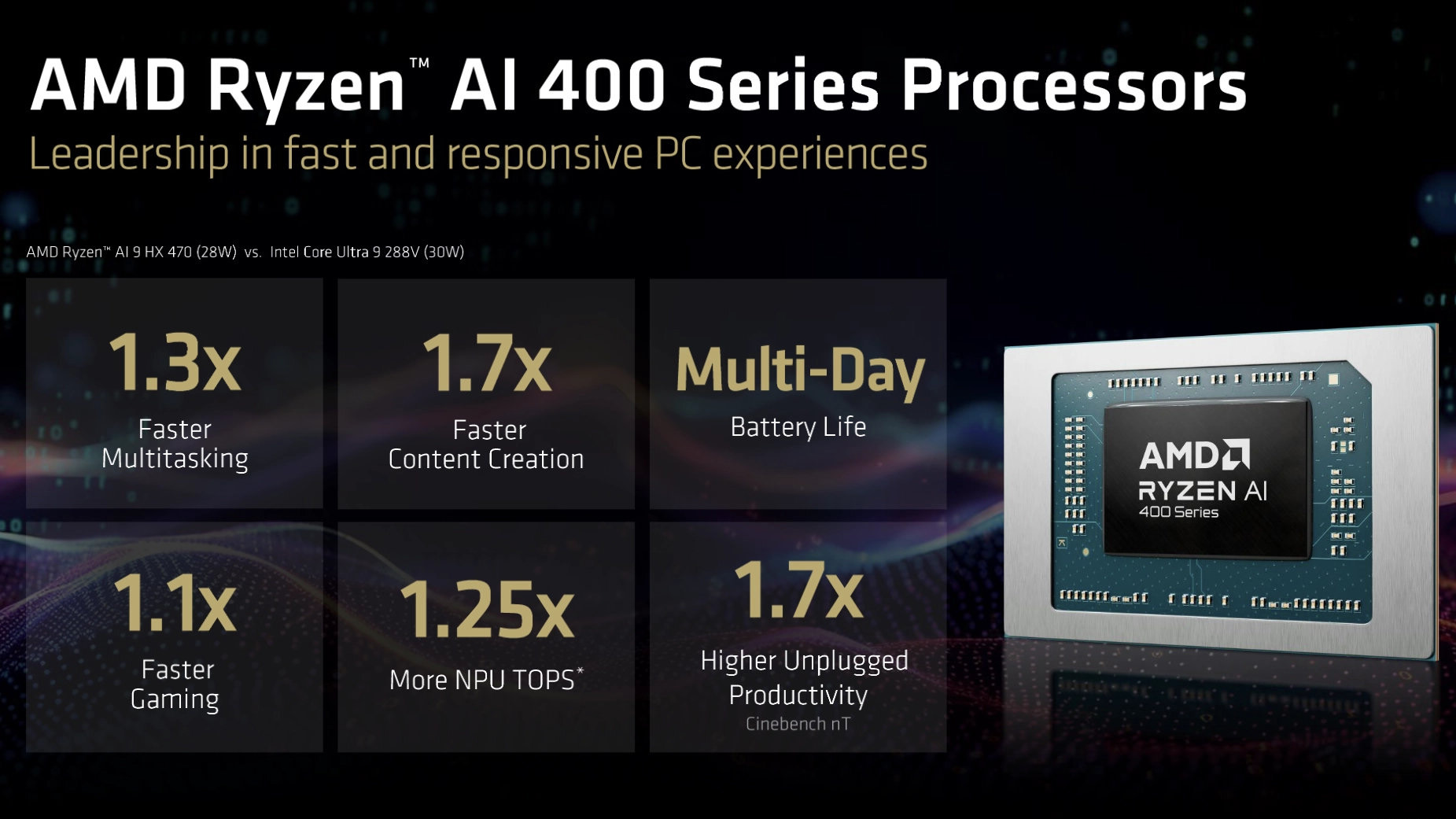 AMD опублікувала слайди з порівнянням продуктивності Ryzen AI 9 HX 470 та Intel Core Ultra 9 288V. У створенні контенту AMD заявляє про +71% середнього FPS у звичайних програмах. Для ігор заявлена середня перевага FPS +12% за низьких налаштувань у роздільній здатності 1080p.